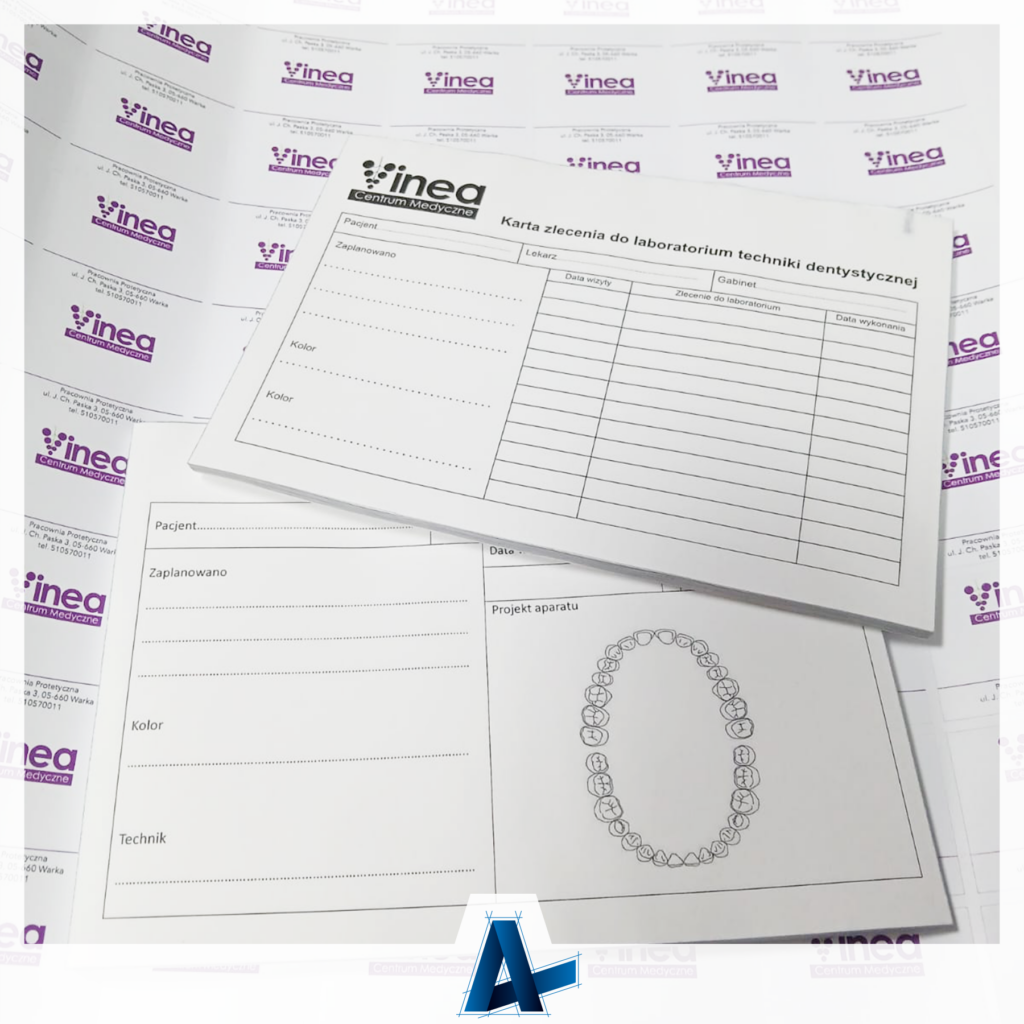 Kolejna realizacja zakończona sukcesem! Tym razem mieliśmy przyjemność przygotować boczki samokopiujące oraz zestaw naklejek dla Centrum Medycznego Vinea. Materiały zostały zaprojektowane z myślą o codziennym komforcie pracy personelu medycznego oraz spójnej identyfikacji wizualnej placówki.